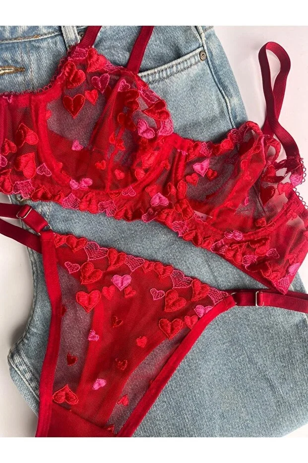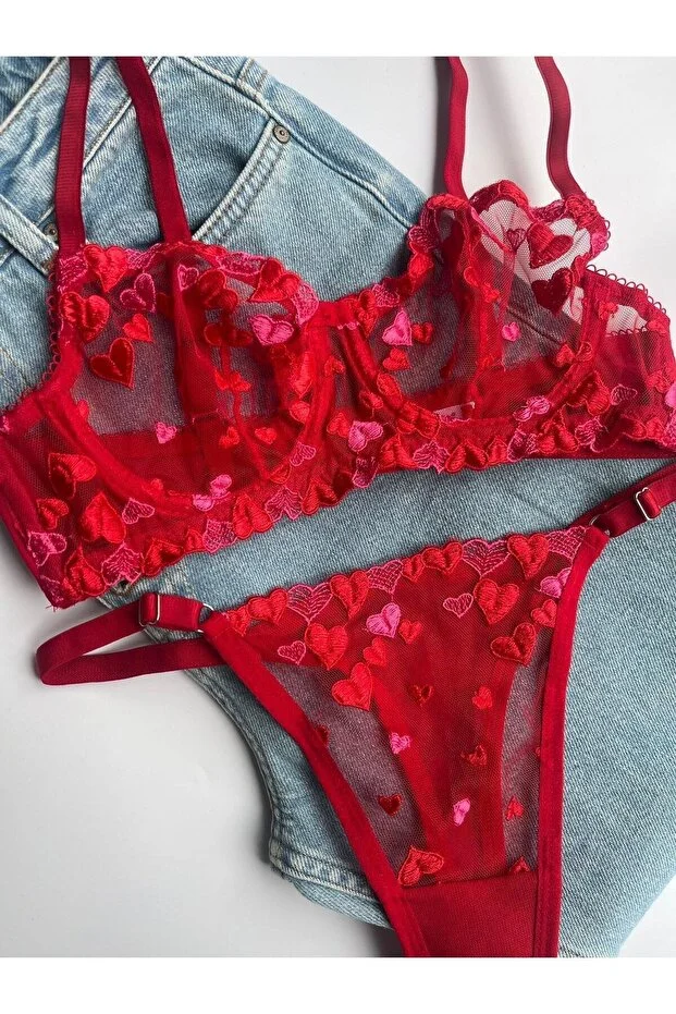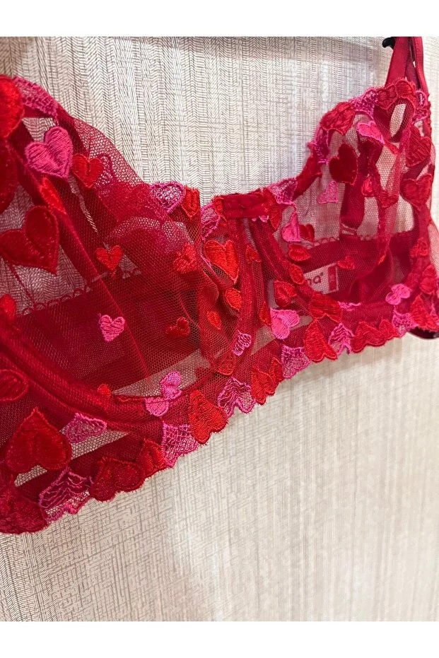 طقم حمالة صدر سلكية بتصميم قلب أحمر خاص بعيد الحب من ديم ميريز