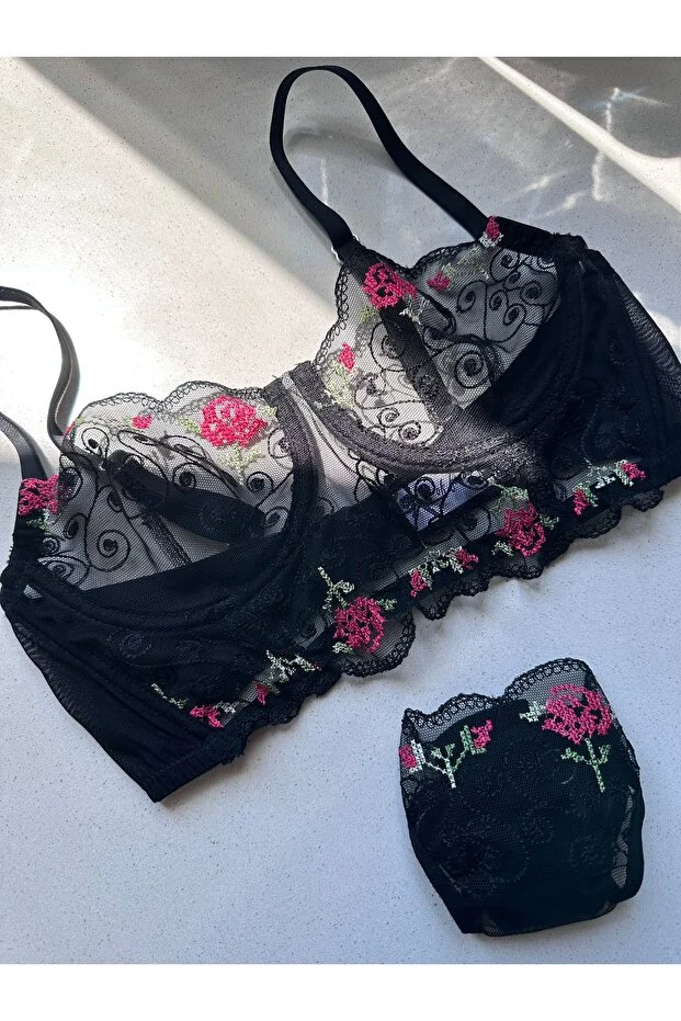 طقم حمالة صدر سوداء مزينة بالزهور من GirlsOfFancy