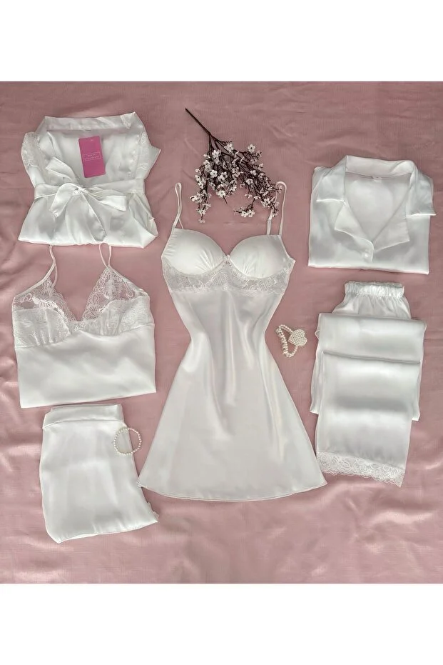 طقم زفاف من 6 قطع من إم إتش موني هوم ويرز، يتضمن قميص نوم أبيض مغطى، ورداء، وبيجامة.