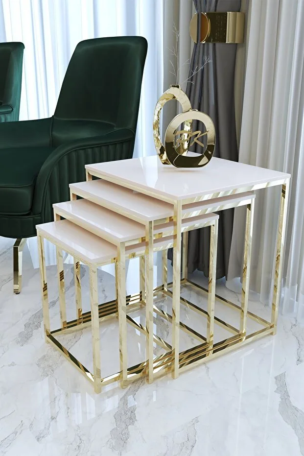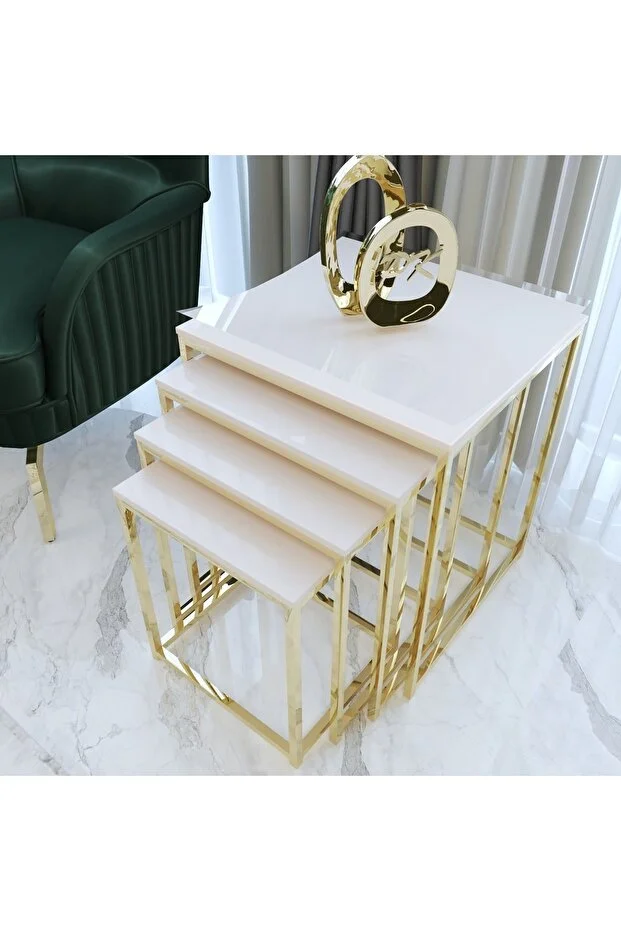 طقم طاولات قهوة مربعة متداخلة من بوكلايف دورو مكون من 4 قطع بأرجل ذهبية وخشب MDF كريمي اللون