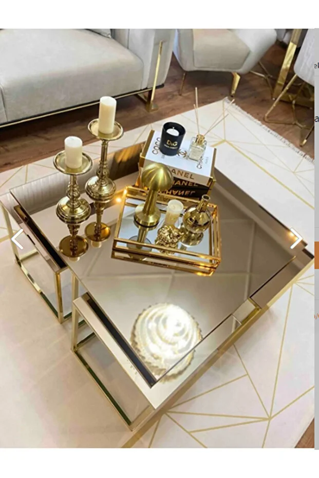 0 Review Of Product طقم طاولة قهوة من MYDECO Madrid مكون من 5 قطع، مطلي بالذهب والبرونز مع مرآة، طاولة متداخلة، طاولة جانبية، وطاولة قهوة بوهيمية