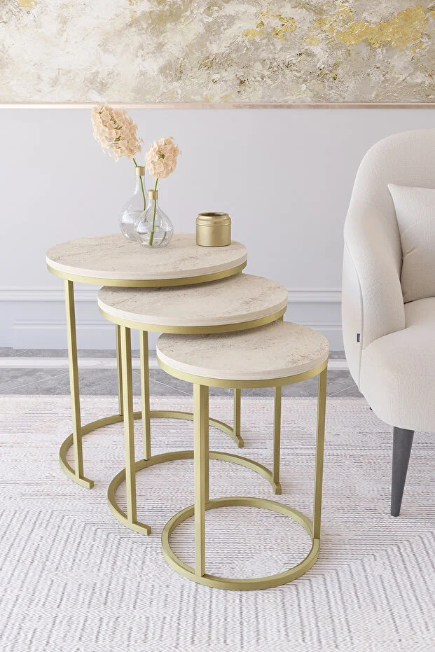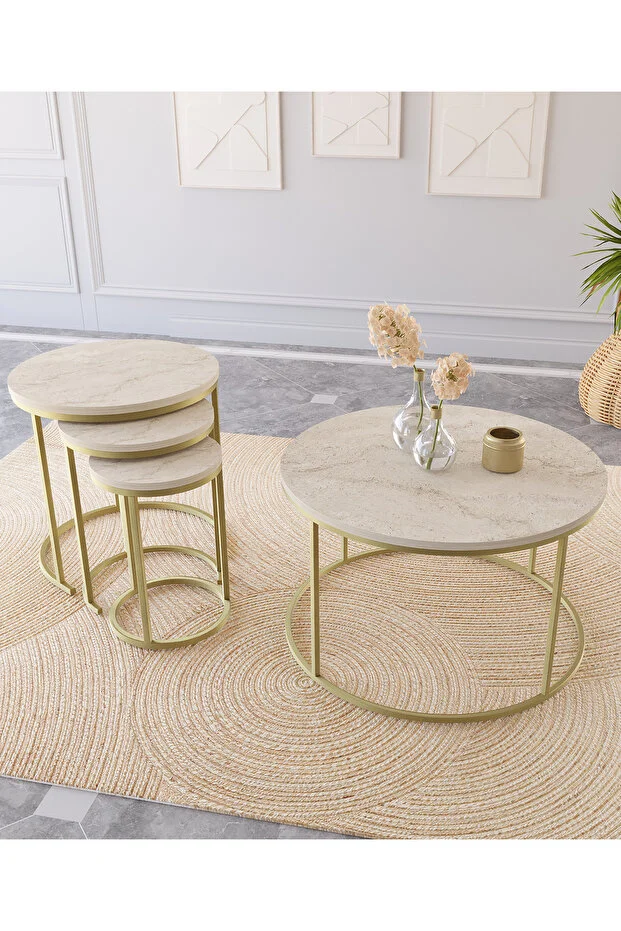 طقم طاولة قهوة وطاولة جانبية من ديكوبورت رويال بأرجل معدنية وسطح طاولة بنمط الترافرتين