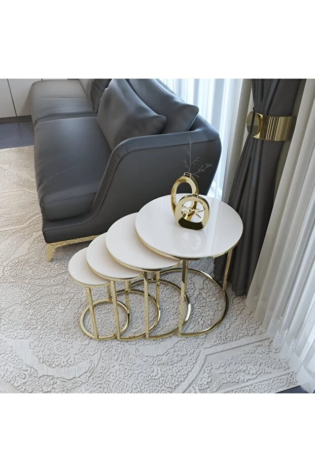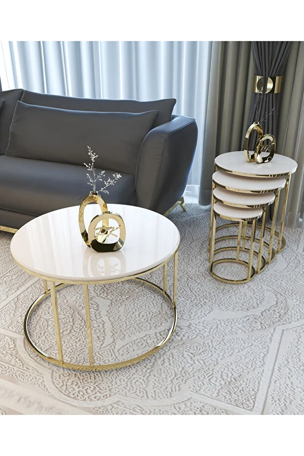 طقم طاولة قهوة وطاولة متداخلة من أربع قطع من بوكلايف، طراز سيلين، بأرجل معدنية ذهبية وسطح من خشب MDF بلون كريمي لامع.