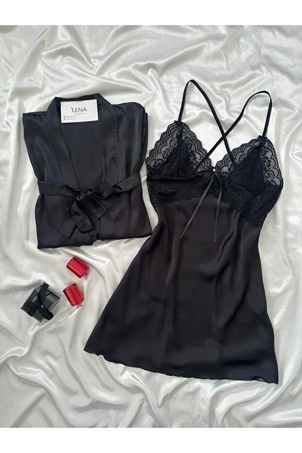 طقم لينا هوم ويرز من قطعتين من الساتان الأسود، يتكون من قميص نوم وروب
