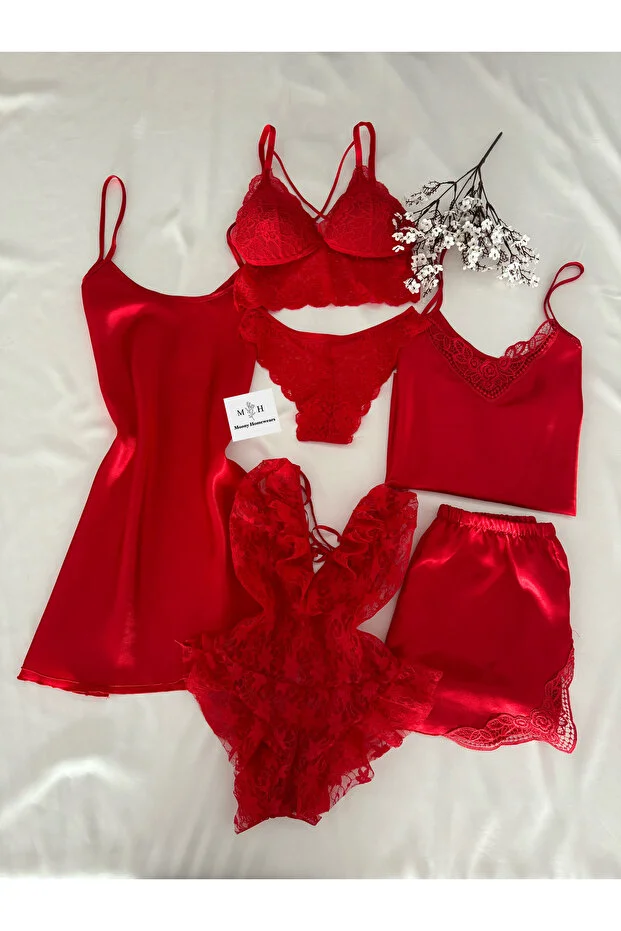 طقم ملابس منزلية من MH Moony Homewears مكون من ست قطع من بيجامات الساتان وقميص النوم والملابس الداخلية
