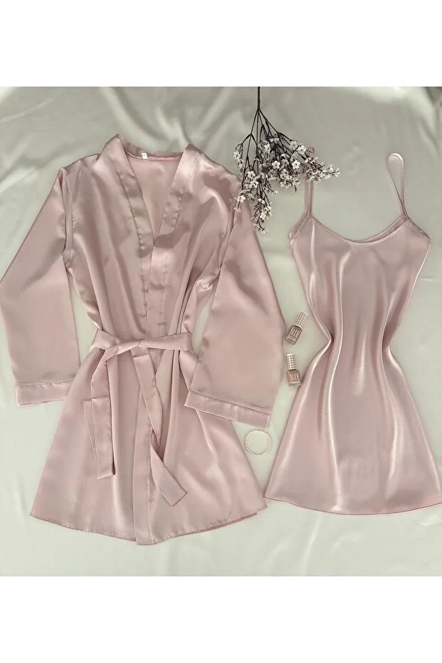 طقم ملابس نوم ورداء حمام من MH Moony Homewears مكون من قطعتين من الساتان البودرة