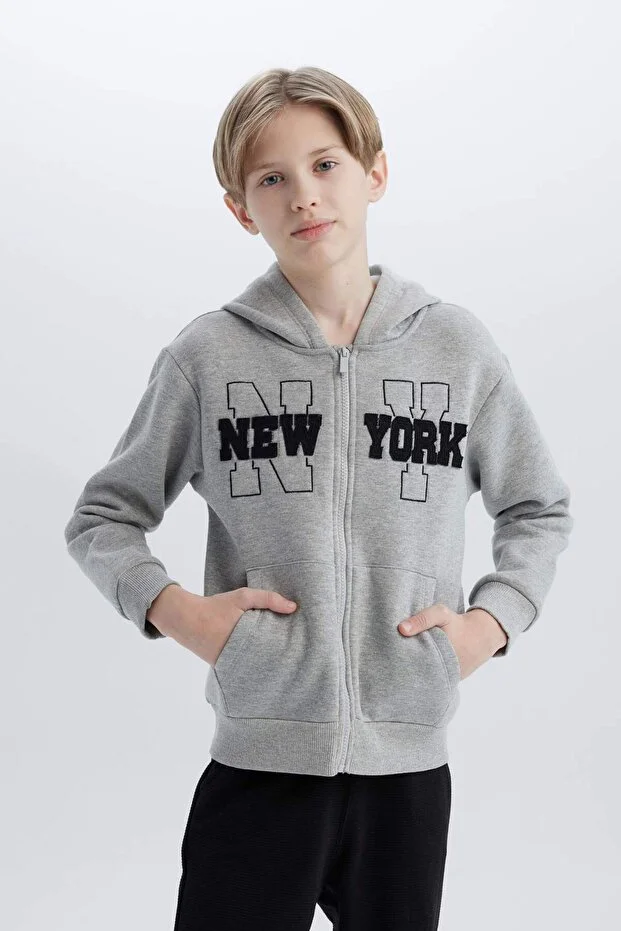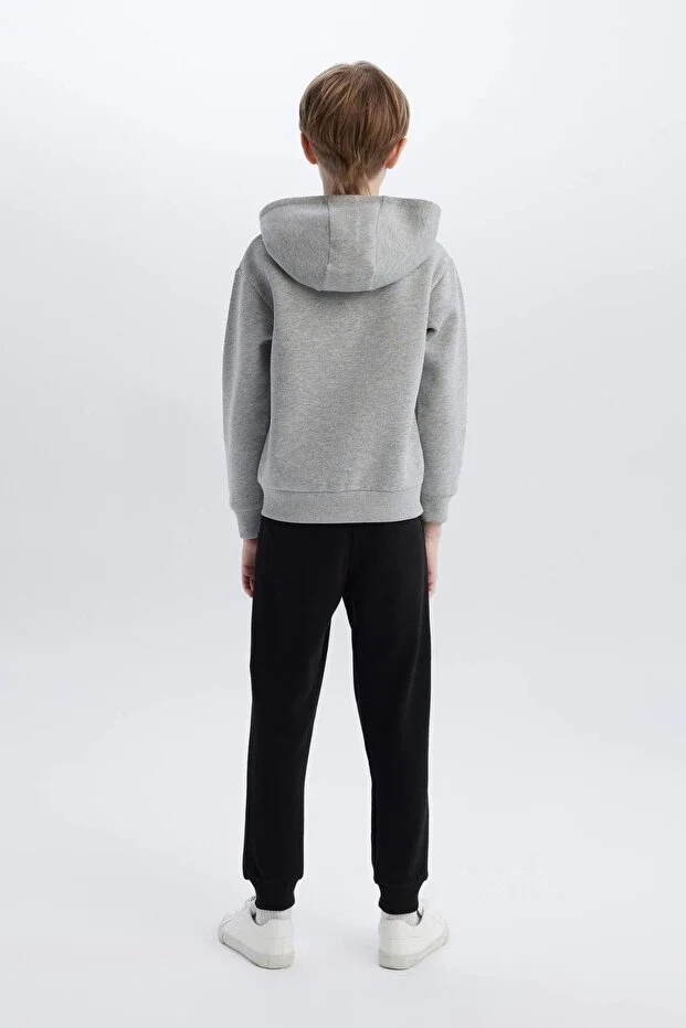 طقم Defacto للأولاد من قطعتين، سويت شيرت مطبوع بسحاب وغطاء رأس، بنطال رياضي بخصر مرن، D2035A824AU
