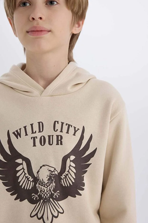 طقم Defacto للأولاد من قطعتين، سويت شيرت مطبوع بغطاء رأس وخصر مرن وبنطال رياضي E1931A824CW