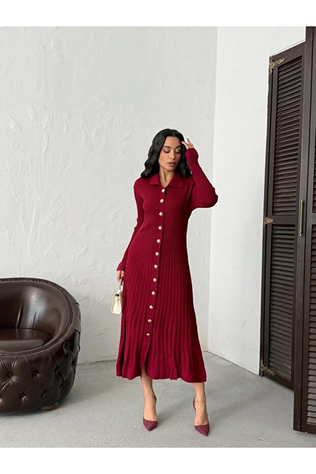 فستان قميص نسائي أنيق طويل محبوك بأزرار باللون العنابي من BEJNA