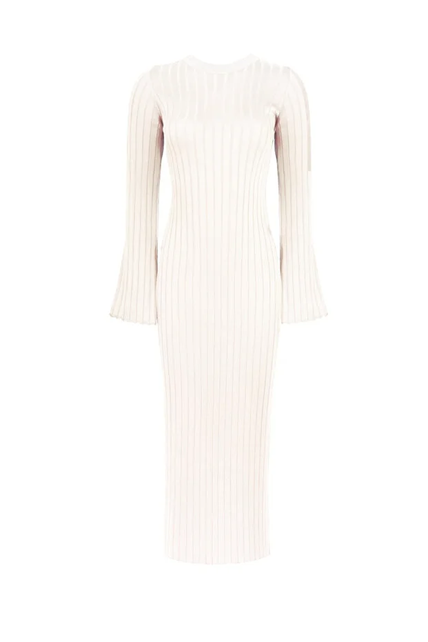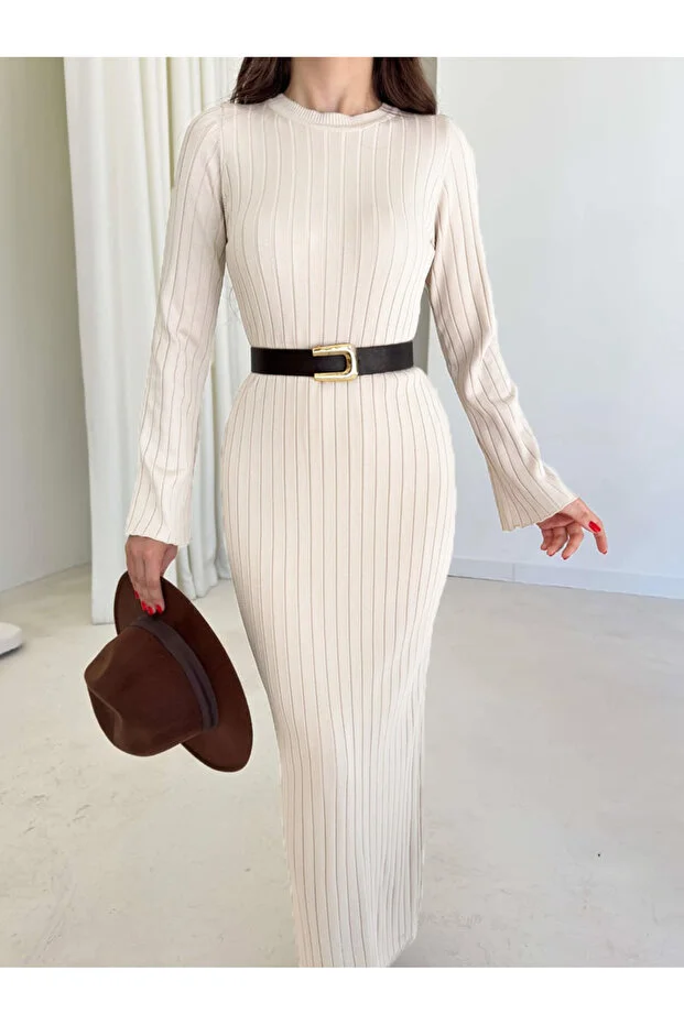 فستان ماكسانا الطويل الأنيق المحبوك - لون بيج فاتح - مناسب للمقاسات الصغيرة والمتوسطة والكبيرة.