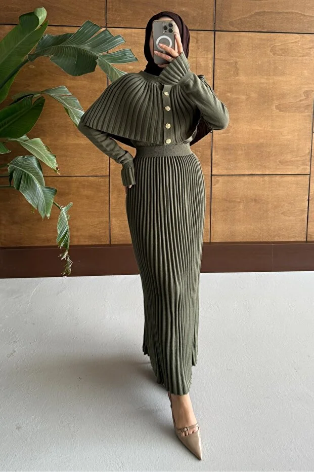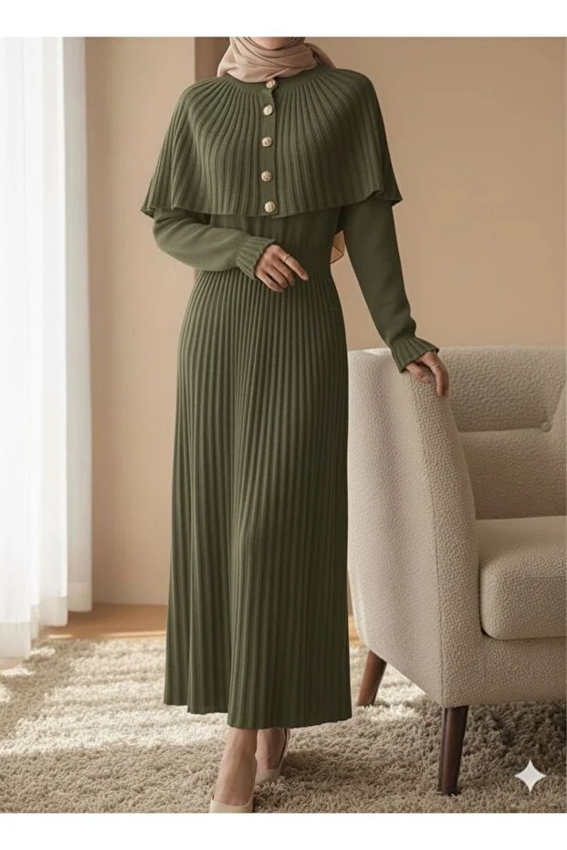 فستان نسائي طويل محبوك بتفاصيل كيب