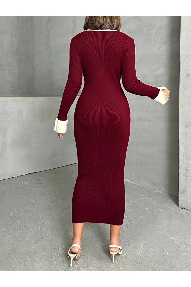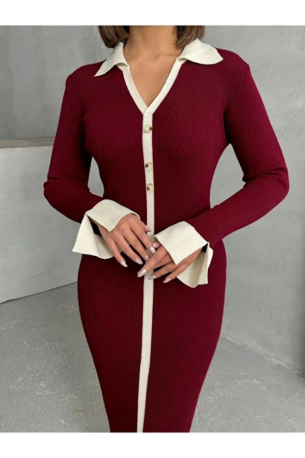 فستان نسائي من General Brands بتصميم محبوك متوسط الطول بأكمام أنيقة وياقة بولو باللون العنابي