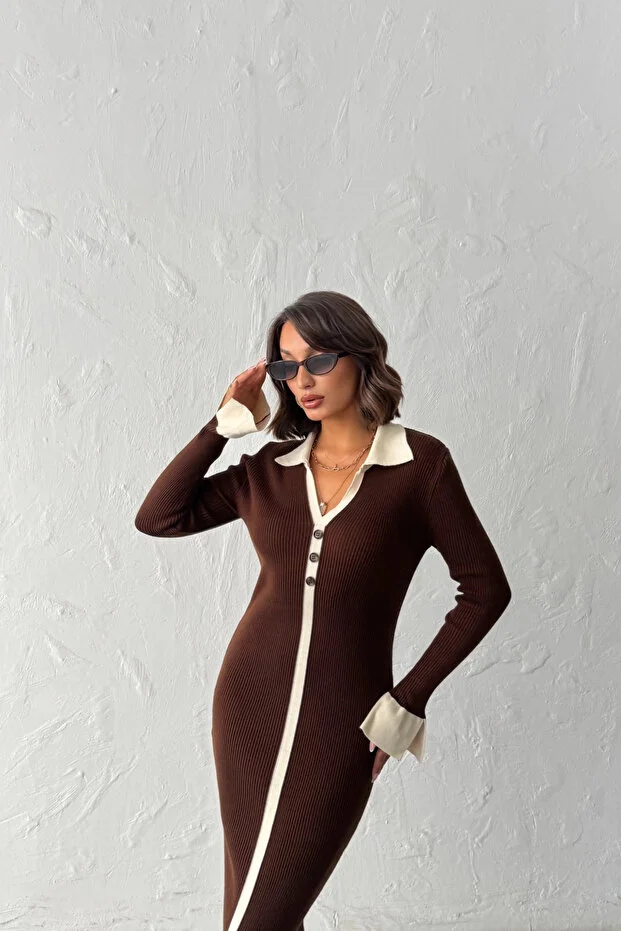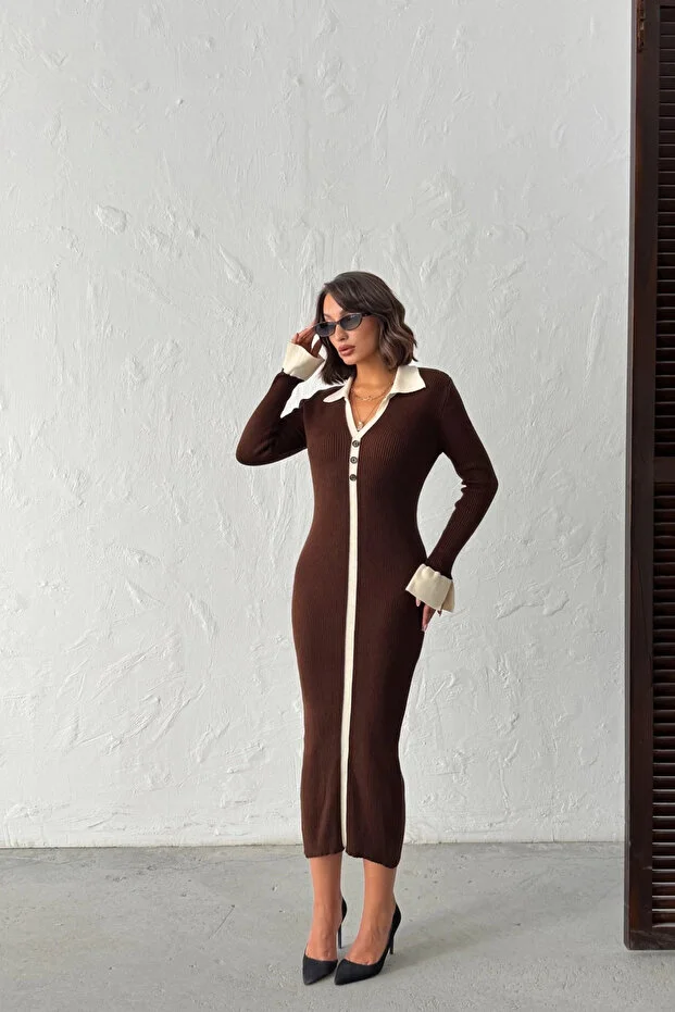 فستان نسائي من URİS بني اللون بياقة بولو وأكمام أنيقة وتفاصيل ميدي محبوكة (لون جديد)