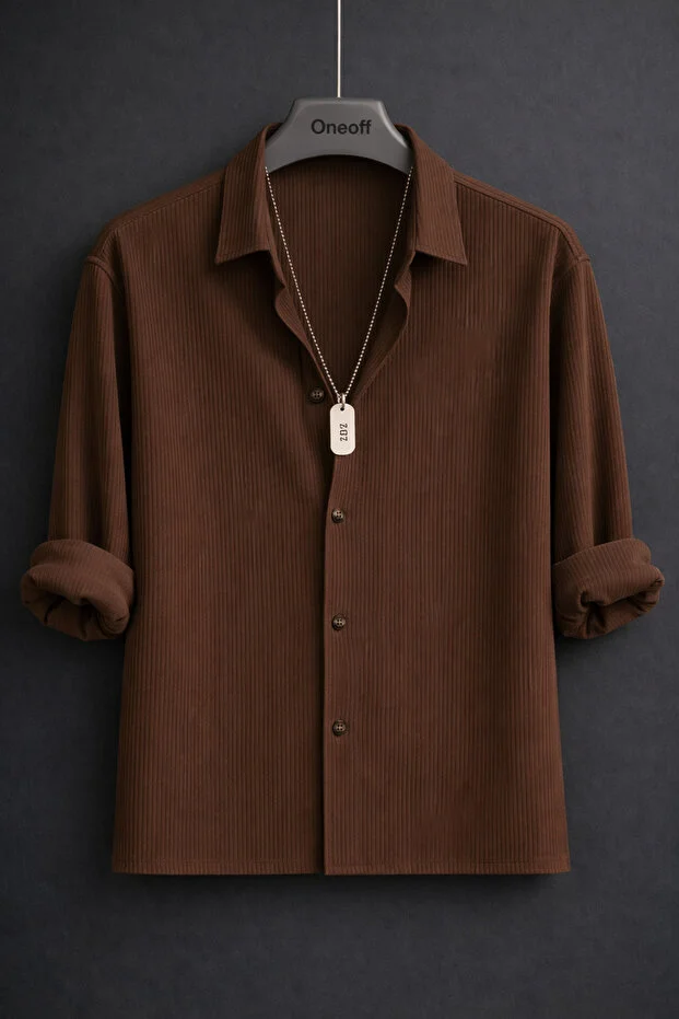 قميص رجالي شتوي من قماش الكوردروي بلون القهوة، بنقشة عثمانية، مقاس كبير