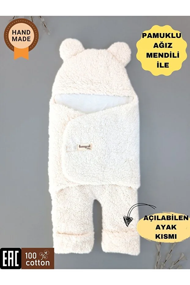 كيس نوم شتوي من تومويكوك، مصنوع من قماش ويلسوفت الناعم، مزود بأذنين، بلون بيج فاتح، وحشوة من الألياف. مناسب للأطفال من عمر 0 إلى 12 شهرًا.
