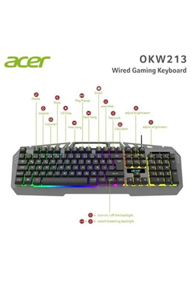 لوحة مفاتيح ألعاب ACER Okw213 رمادية بإضاءة خلفية RGB بألوان قوس قزح، لوحة مفاتيح سلكية بألوان قوس قزح، طول الكابل 1.5 متر