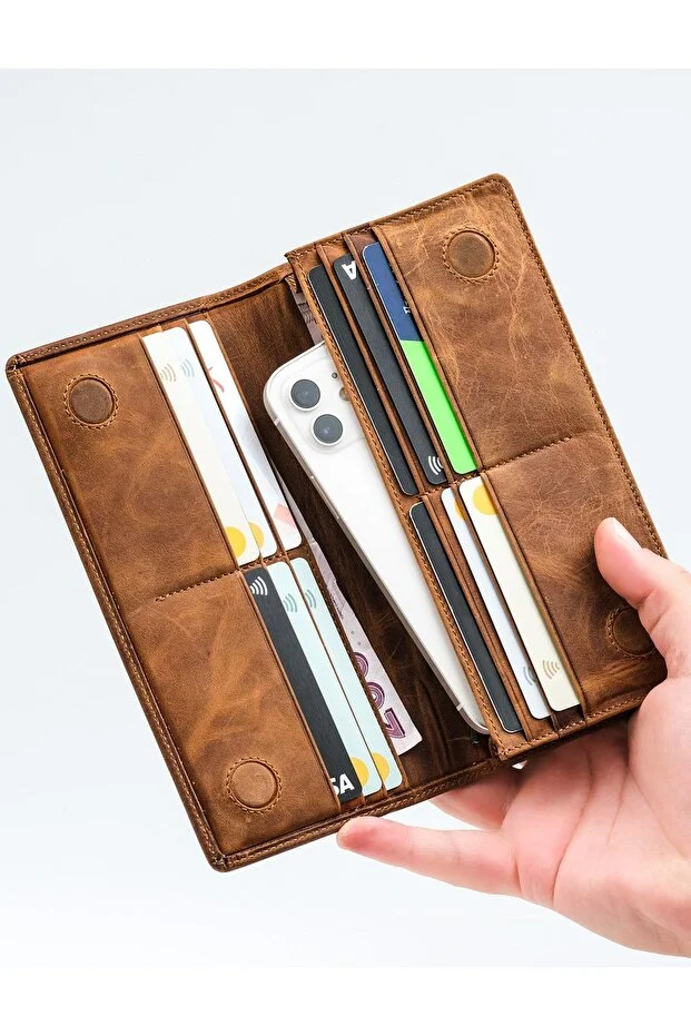 لويز موتو ألبا - محفظة مع حجرة للهاتف - محفظة طويلة من الجلد الطبيعي - حزام مغناطيسي وحزام يد، للجنسين - بني فاتح
