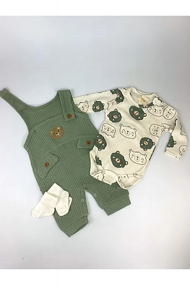متجر مايزي طقم أفرول للأولاد الرضع، مكون من 3 قطع - طقم أفرول وجوارب مطرز بنقشة دب تيدي، قطن أخضر