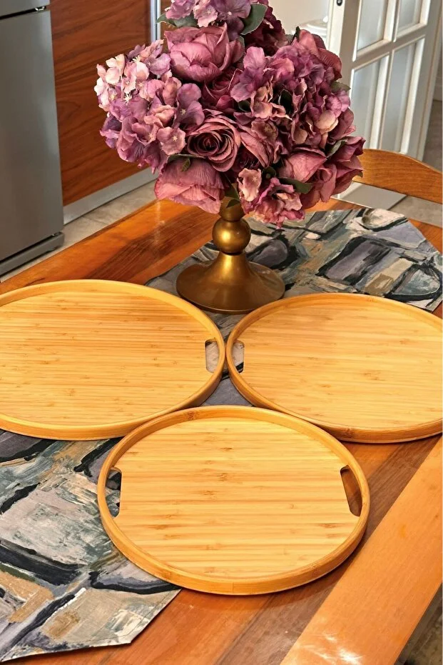 مجموعة صينية دائرية من الخيزران من ماكري هوم، مكونة من 3 قطع، صينية من الخيزران بأقطار 30 سم و35 سم و38 سم، مع مقبض