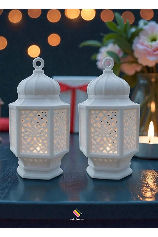 0 Review Of Product مجموعة فانوس رمضان الأبيض من قطعتين من "لايف إن جيمز" - فانوس رمضان مزخرف مع شمعة صغيرة كهدية