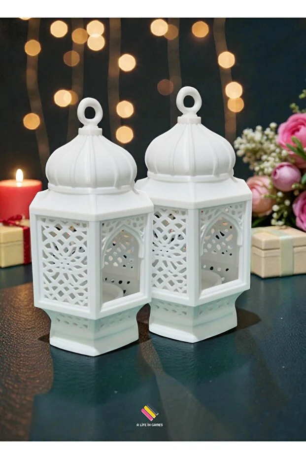 مجموعة فانوس رمضان الأبيض من قطعتين من "لايف إن جيمز" - فانوس رمضان مزخرف مع شمعة صغيرة كهدية