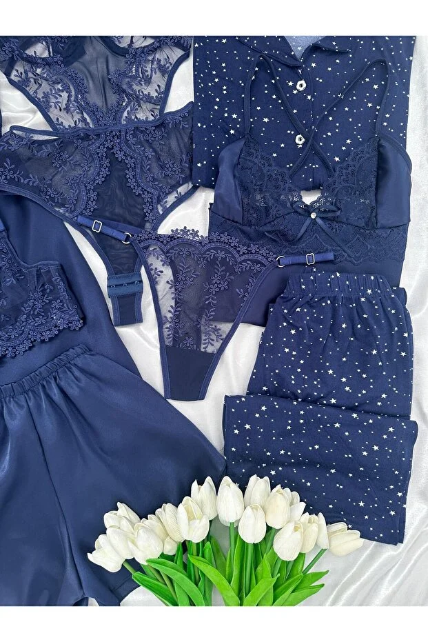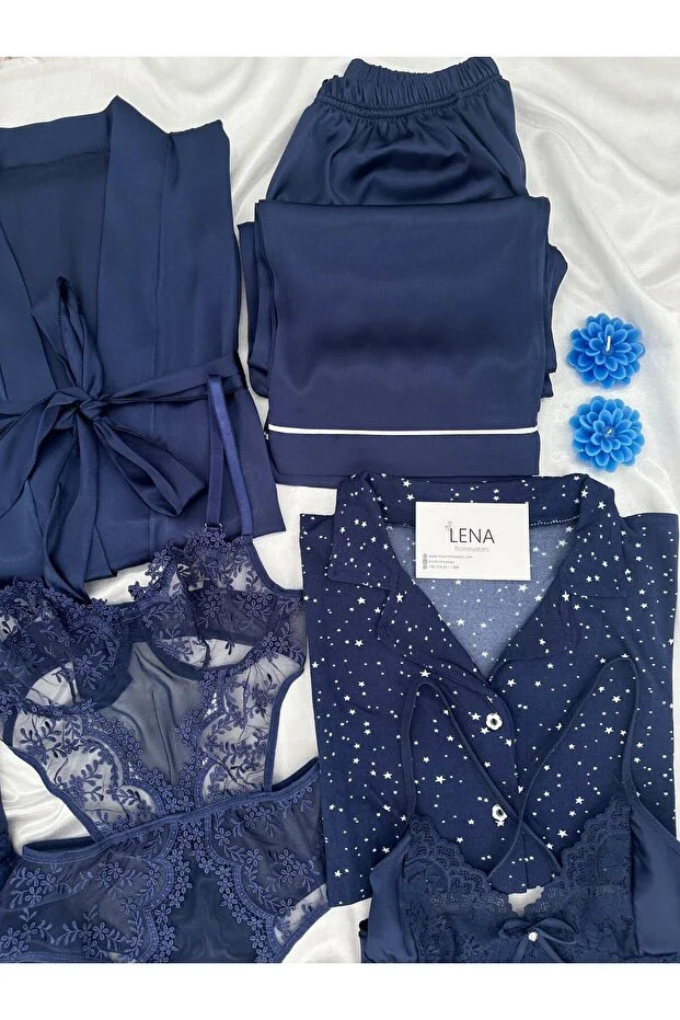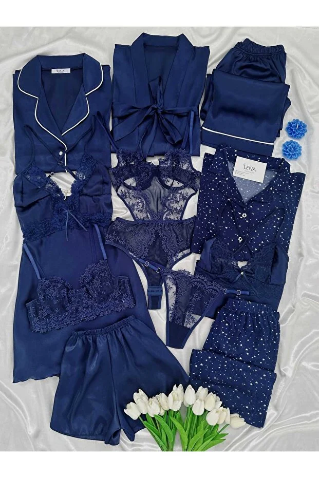 مجموعة ملابس منزلية فاخرة من لينا هوم ويرز، مكونة من 11 قطعة، بيجامات عملاقة، ثوب نوم، رداء حمام، ملابس داخلية، طقم دووري، مصنوع من الساتان الأزرق الداكن
