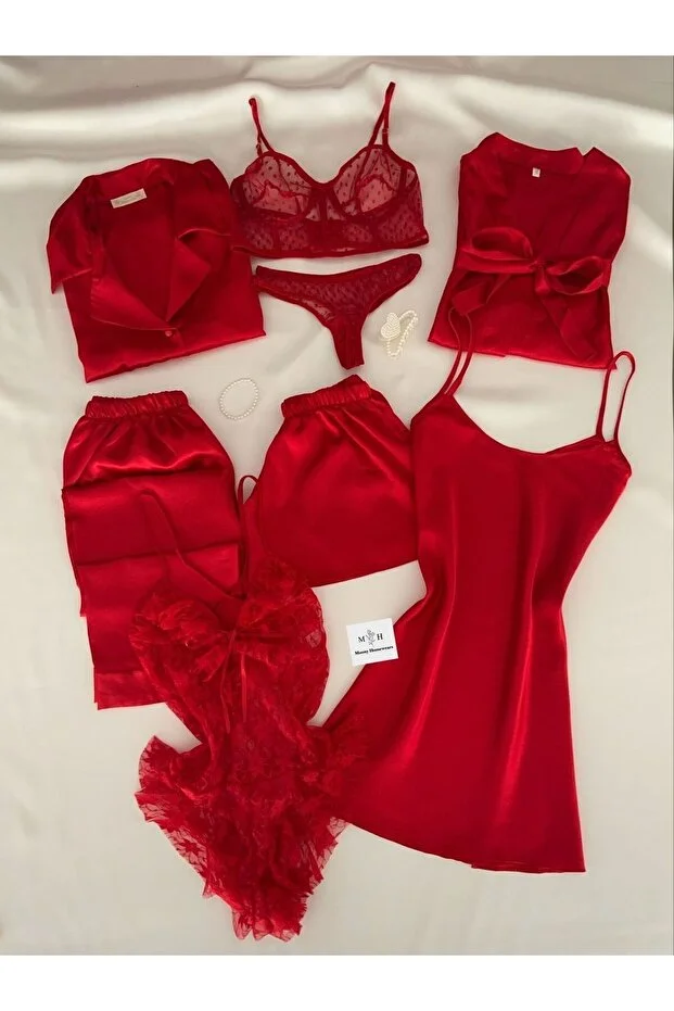 مجموعة ملابس منزلية من MH Moony Homewears، مكونة من 8 قطع بيجامات ساتان حمراء، ملابس نوم، ملابس داخلية، مجموعة Legendary Dowry