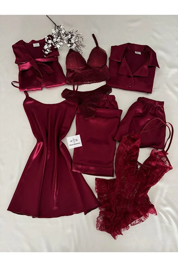 0 Review Of Product مجموعة ملابس منزلية من MH Moony Homewears، مكونة من 8 قطع بيجامات ساتان عنابي عملاقة، ثوب نوم، رداء حمام، ملابس داخلية، طقم دووري