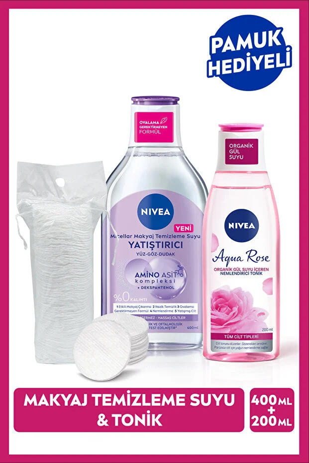مزيل مكياج ميسيلار مهدئ من نيفيا 400 مل وتونر مرطب أكوا روز 200 مل، مع وسادات قطنية مجانية.
