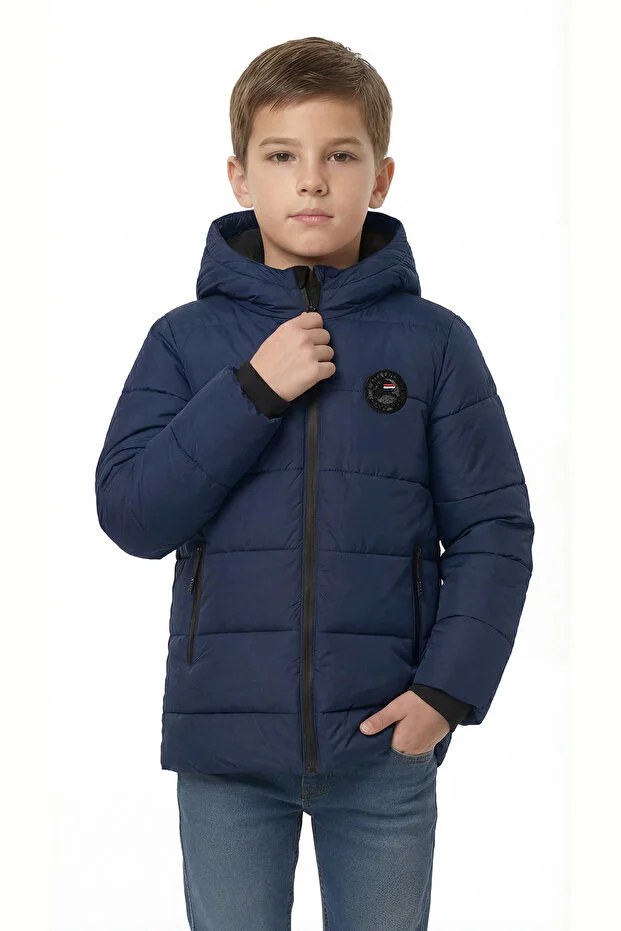 معطف شتوي أزرق داكن للأولاد من QUWWA مزود بغطاء رأس وبطانة من الفرو الأسود، خفيف الوزن، مقاوم للماء والرياح.
