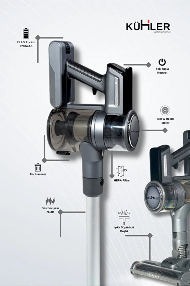 مكنسة كهربائية عمودية قابلة لإعادة الشحن من نوع كولر كرافتماكس KH-V700، مزودة بفرشاة توربو لاسلكية
