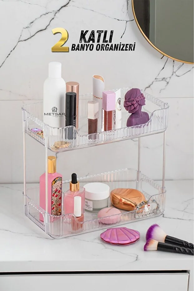 حل مثالي لتنظيم منزلكِ وتخزين أغراضكِ بشكل منظم! مصنوع من بلاستيك كريستالي بطبقتين، يتميز منظم المكياج الأنيق هذا، بأرجله المعدنية، بتصميمه الجميل ومتانته. إنه الطريقة العملية لتنظيم مجموعة متنوعة من الأغراض، من المكياج إلى موزعات الشامبو والمجوهرات!