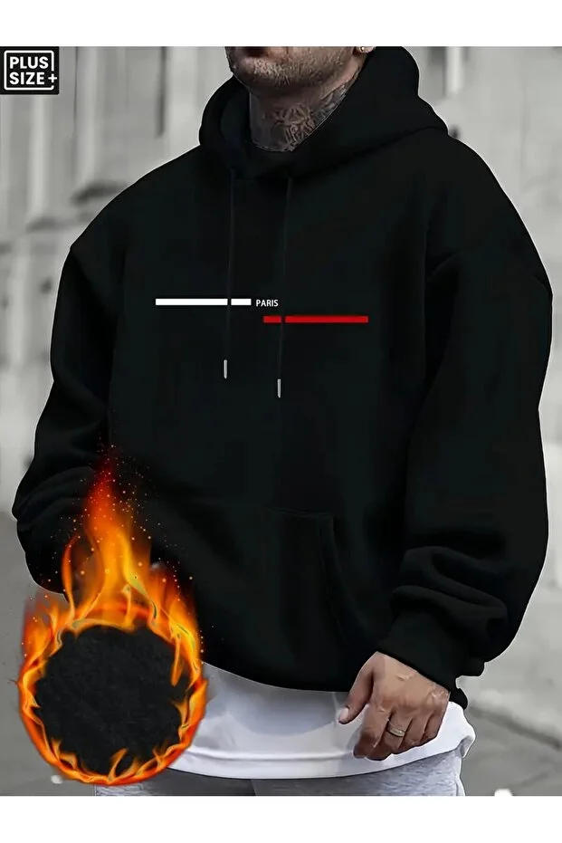 هودي ثقيل H&GHAMLEGİYİM للرجال - لون أسود برسومات باريس مقاس كبير PLUS