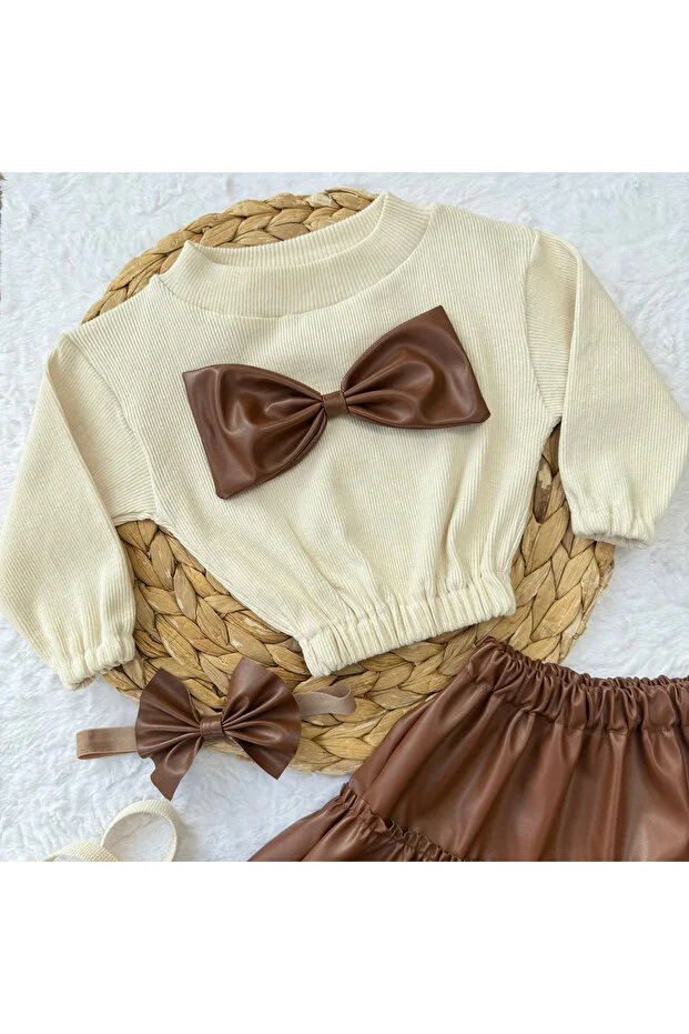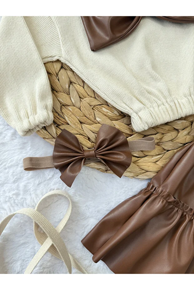 AKİF GİYİM Girls & Baby Set Leather Skirt Bowknot Body Bandana Set