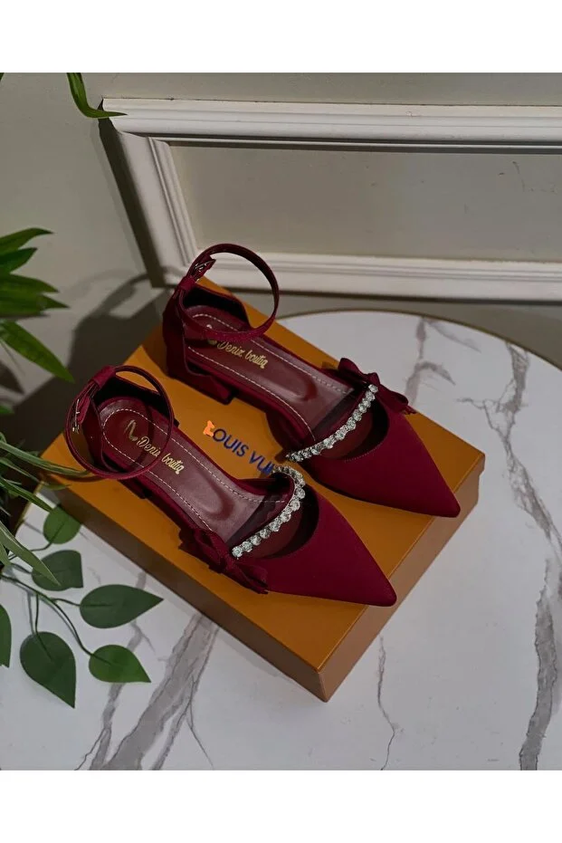 ALNASER MODA حذاء ساتان بكعب منخفض باللون العنابي مع فيونكة مرصعة بالأحجار