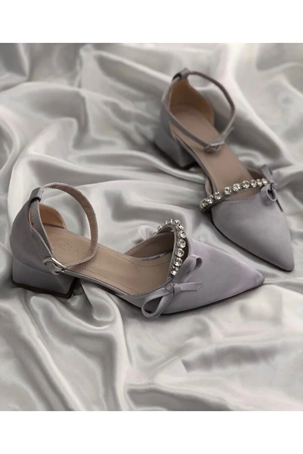 ALNASER MODA حذاء من الساتان الفضي - كعب مزين بالأحجار