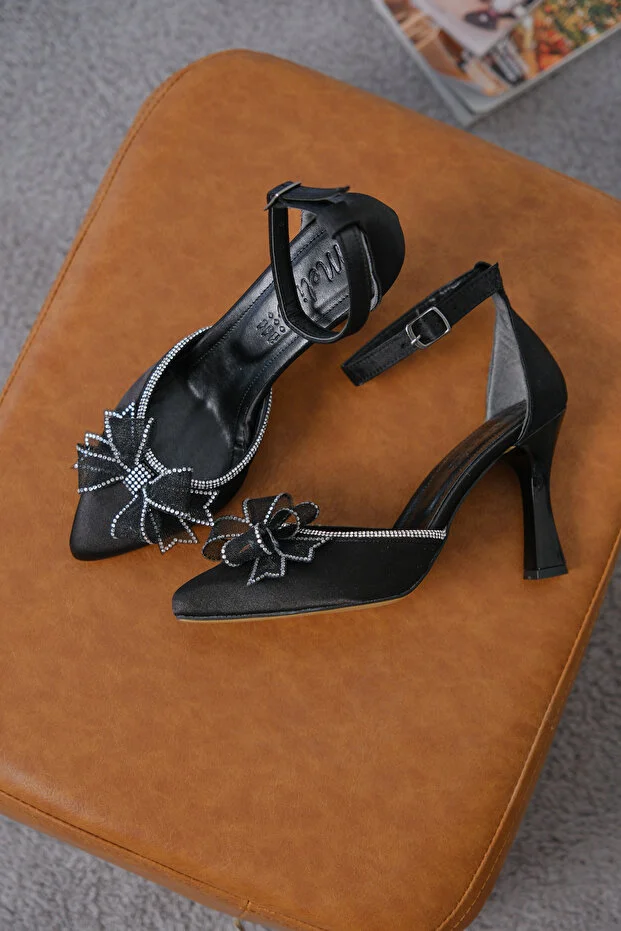 0 Review Of Product BAKGİY حذاء نسائي من الساتان الأسود مزين بفيونكة من التول وأحذية سهرة أنيقة بكعب