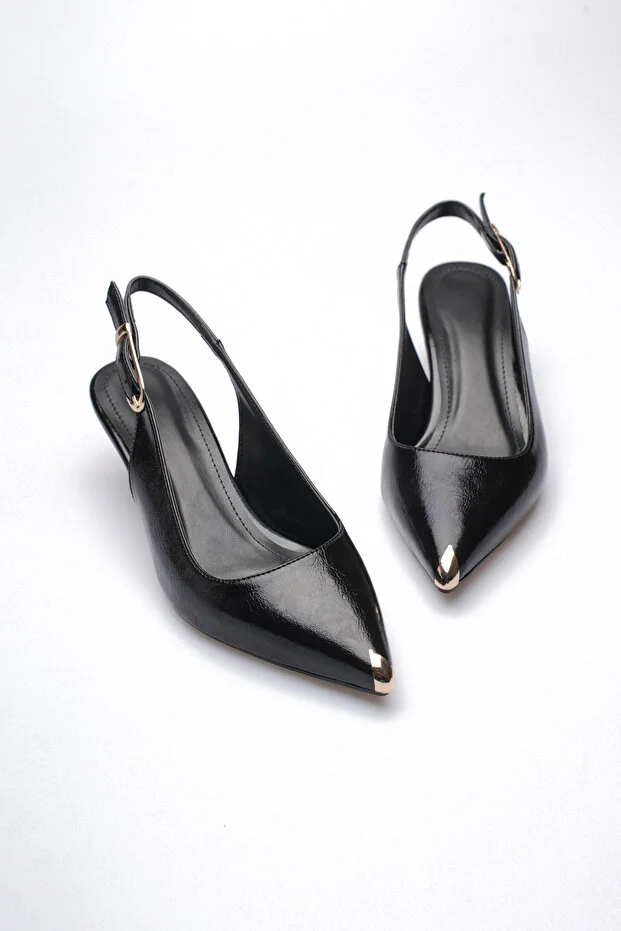0 Review Of Product CİMİLİ SHOES حذاء نسائي أسود من الجلد اللامع المجعد مع تفاصيل معدنية عند مقدمة الحذاء وكعب بارتفاع 3 سم