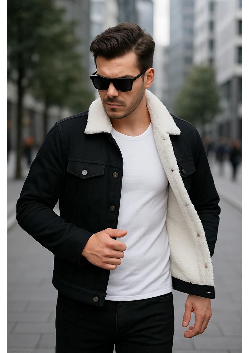 0 Review Of Product Pobudo معطف الدنيم للرجال باللون الأسود مع الفراء في الداخل